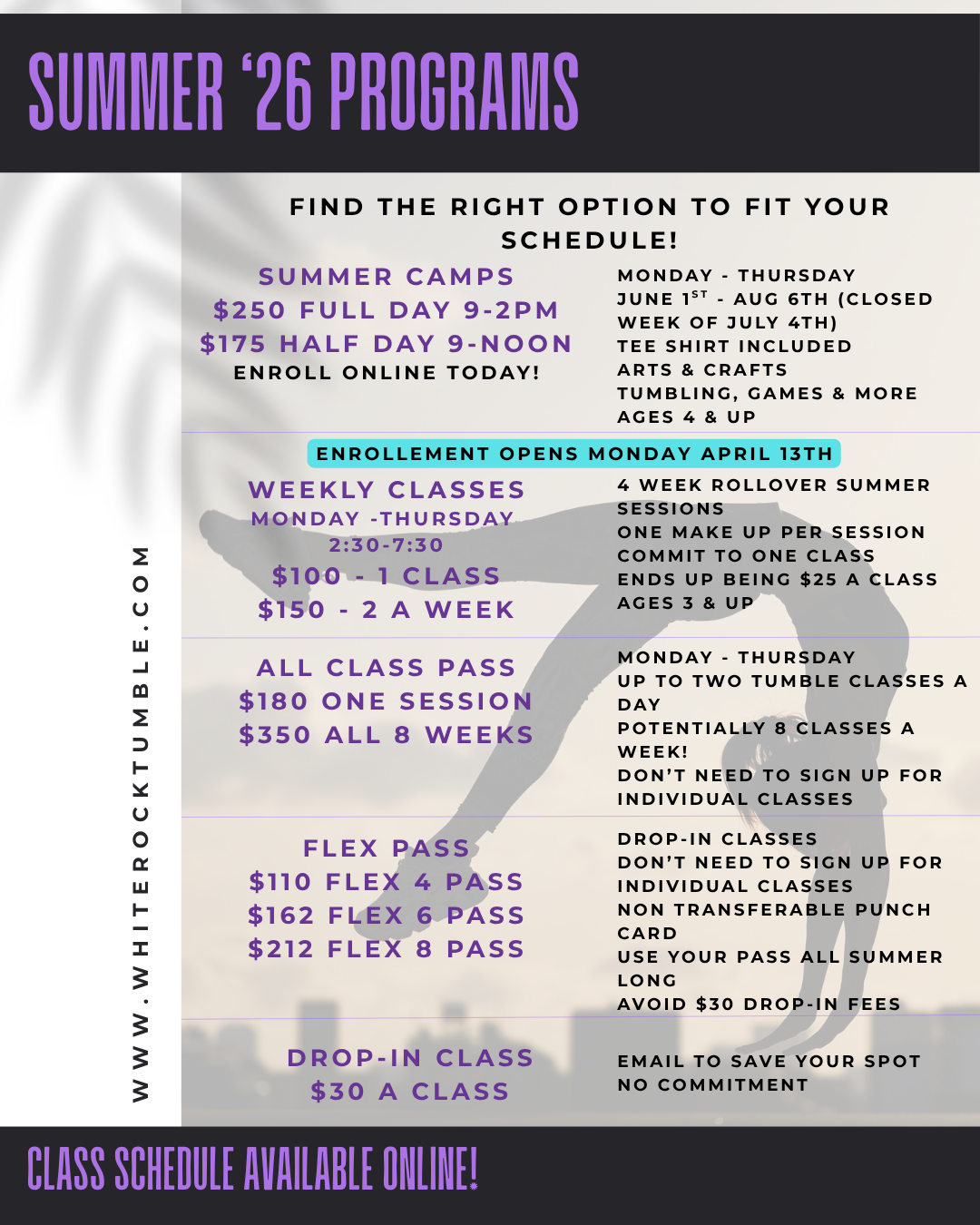 We offer tumbling classes for kids ages 1 and up. We offer a wide variety of classes from the beginner to the advanced tumbler. We are confident that we have a class perfect for your child. Stop by our gym to meet our staff, pick up a schedule, enroll in a class or just to say hi.